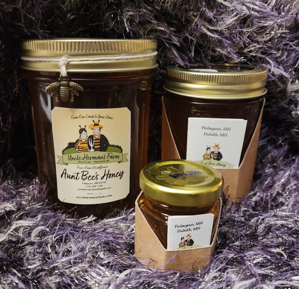 Honey sizes available to buy include honey sticks, 2 oz gift size, half pint, pint, and quart.